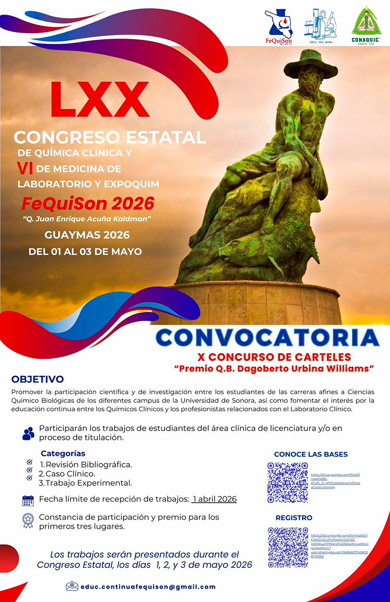 Te invitamos a participar en el Concurso de Carteles dentro las actividades del LXX Congreso Estatal de Química Clínica y VI de Medicina de Laboratorio y ExpoQuim FeQuiSon 2026.